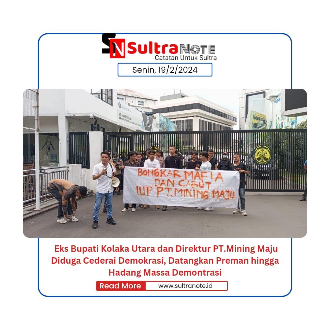 JAKARTA – Konsorsium Mahasiswa dan Pemuda Indonesia (komando),Eks Bupati kolaka Rusda Mahmud dan Direktur PT.Mining Maju, diduga datangkan preman hingga hadang massa demontrasi di Dirjen Minerba dan Istana Negera, untuk mendesak Ir. H. Joko widodo segera menginstrusikan Aparat Penegak Hukum (APH), untuk priksa oknum yang terlibat dalam dugaan pelanggaran hukum oleh PT.Mining Maju. Senin (20/2/2024)