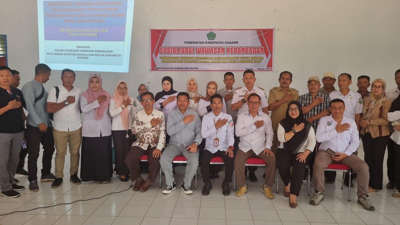 SULTRANOTE.ID, KONAWE -Menjelang Pemilihan Umum (Pemilu) serentak Legislatif dan Pilpres tahun 2024, Badan Kesatuan Bangsa dan Politik (Kesbangpol) Kabupaten Konawe Provinsi Sulawesi Tenggara (Sultra) menggelar Sosialisasi Wawasan Kebangsaan, Rabu 18 Oktober 2023 di Unaaha.