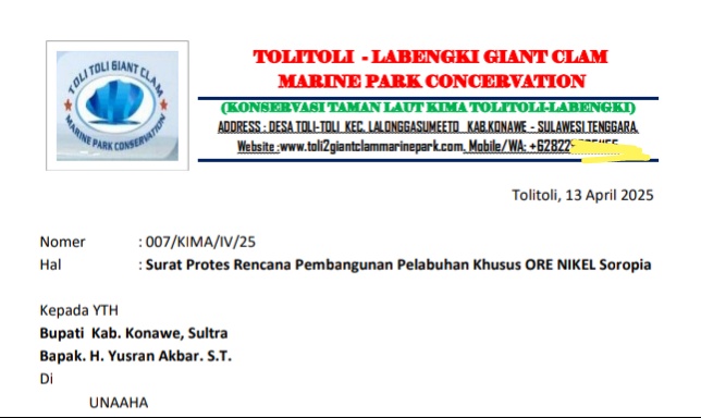 Konawe, Sultranote.id – Rencana pembangunan Pelabuhan Khusus Ore Nikel di Kecamatan Soropia, Kabupaten Konawe, Sulawesi Tenggara, menuai penolakan keras dari Konservasi Taman Laut Kima Tolitoli-Labengki. Protes resmi disampaikan kepada Bupati Konawe, H. Yusran Akbar, S.T., melalui surat yang dikirimkan pada Minggu (13/4/2025).
