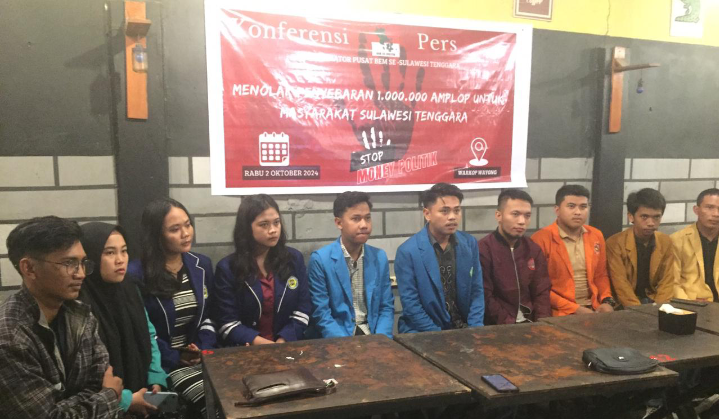 Kendari – Koordinator Pusat (Korpus) Badan Eksekutif Mahasiswa (BEM) se-Sulawesi Tenggara menggelar konferensi pers untuk menyatakan penolakan terhadap rencana penyebaran 1 juta amplop kepada masyarakat Sulawesi Tenggara. Konferensi pers ini berlangsung di Warkop Wayong, Kecamatan Kadia, Kota Kendari, pada Rabu (2/9/2024).