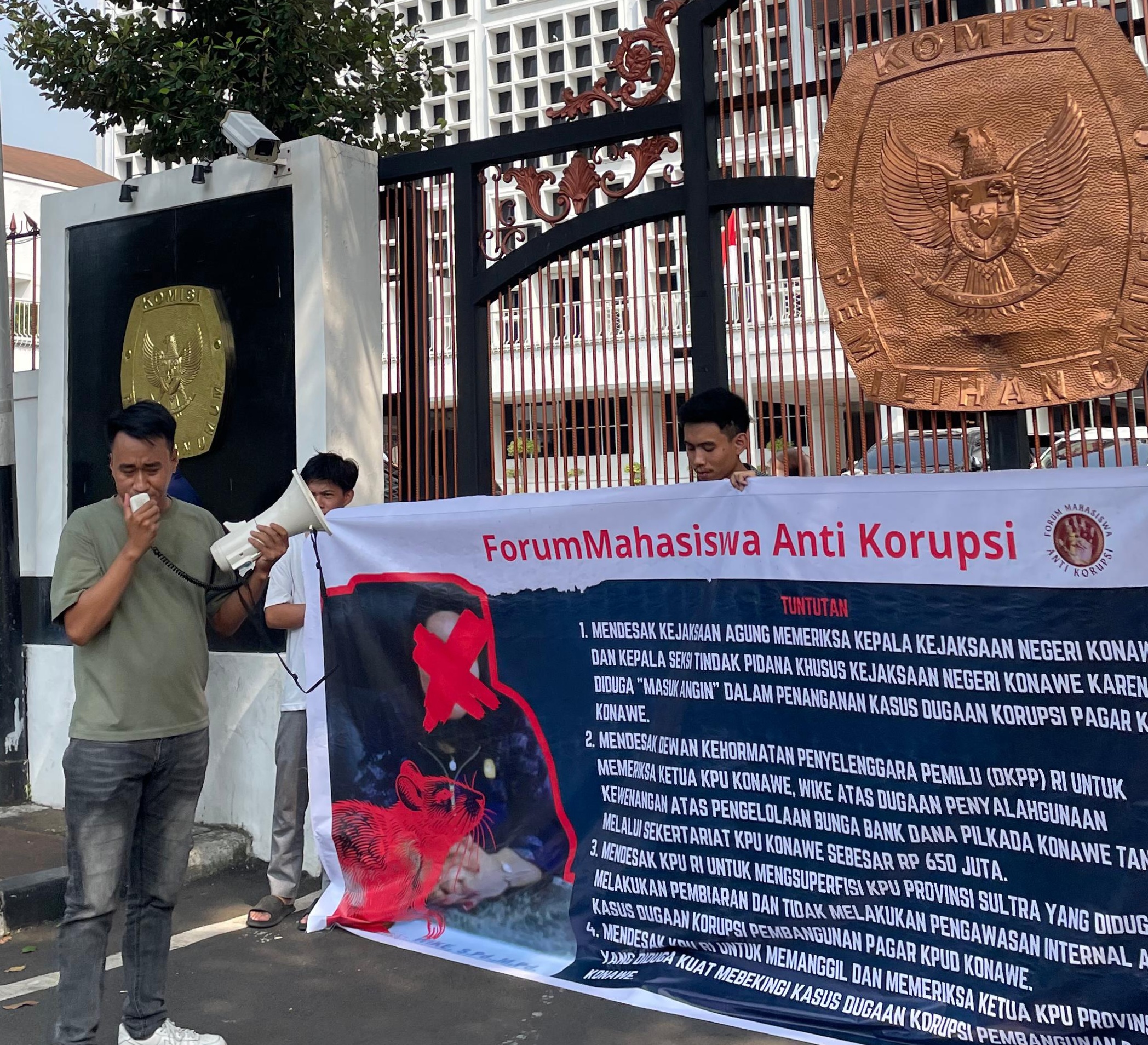 Puluhan mahasiswa asal Konawe yang tergabung dalam forum tersebut turun ke jalan menuntut kejelasan atas penanganan dugaan korupsi pembangunan pagar Kantor KPU Konawe sebesar Rp 650 juta, serta dugaan penyalahgunaan wewenang dalam pengelolaan bunga bank dana Pilkada Konawe.