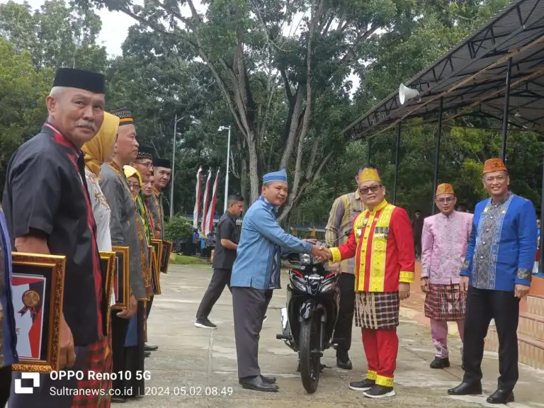 KONAWE – Peringati Hari Pendidikan Nasional, Penjabat Bupati Konawe Dr. H. Harmin Ramba, SE., MM., memberikan Piagam penghargaan dan penyerahan sepeda motor kepada guru lingkup dinas pendidikan kabupaten Konawe di halaman Kantor Bupati Konawe, Kamis (2/5/2024).