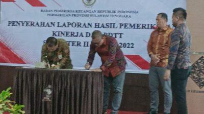 Kepala BPK Perwakilan Provinsi Sultra Dadek Nandemar menyerahkan Laporan Hasil Pemeriksaan (LHP) Kinerja dan Pemeriksaan Dengan…