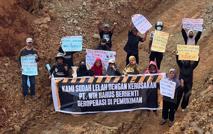 Warga kemudian membentangkan spanduk bertuliskan “Kami sudah lelah dengankerusakan, PT. WIN harus berhenti beroperasi di pemukiman” dan beberapa bentangan spanduk lain yang berisi seruan menjaga lingkungan.